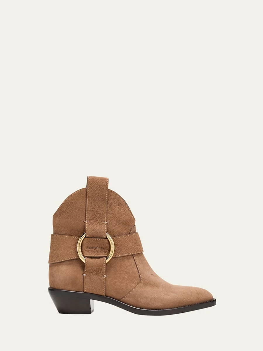 See by Chloe calf leather ankle booties with golden ring harness accent 1.50 in / 40 mm block heel Almond toe Pull-on style Pull tabs at collar Rubber outsole Lining: Leather Spot clean Made in Spain Online Inquiries: BGS21_X6NC1| Store Inquiries: #4844367