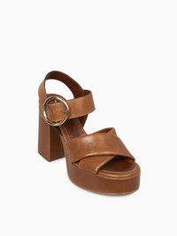 Lyna heeled sandal in light brown calfskin with See By Chloé logo oversized ring buckle. These sandals radiate an elegant and timeless allure while large, padded straps and a chunky heel ensure a comfortable fit. PRODUCT DETAILS Heeled sandal heel height: 70 mm - Upper: calfskin - Sole: rubber - Lining: goatskin Fit true to size - Platform heeled sandal - Functional buckle at the ankle - Embossed See By Chloé logo on buckle - Large padded straps Color: Light Brown Item code: CHS21S033GA533