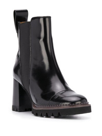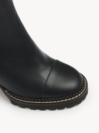 Mallory ankle boot in shiny Texan calfskin with elastic panels at the sides. The contrasting chunky heel and oversized leather loop enhance the leather boot's modern, urban structure. PRODUCT DETAILS Ankle boot heel height: 2.8” (70 mm) - Upper: shiny calfskin - Sole: rubber Fit true to size - Leather boot - External elastic panels Color: black Item code: CHS19A081TC999