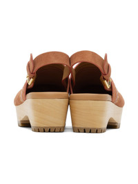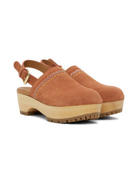 Handcrafted suede clogs in orange. · Embroidered detailing at vamp · Pin-buckle slingback · Logo embossed at leather footbed · Wooden platform midsole · Treaded rubber sole · Platform: H1.25" · Heel: H2" Supplier color: Medium orange Upper: leather. Sole: wood, rubber. Made in Spain 241373F121008