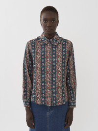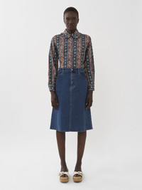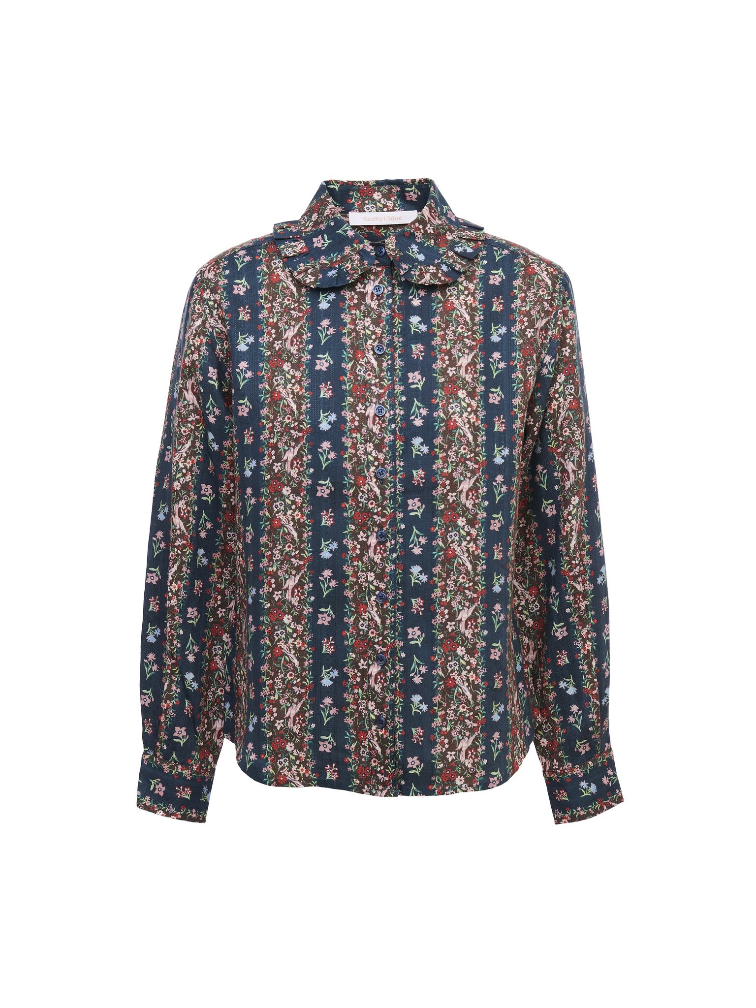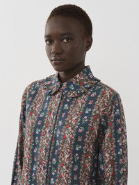 Embellished long-sleeve shirt in a lower-impact linen jacquard with an upholstery-inspired floral stripe print. The ruffled collar lends a feminine finish to this spring piece. PRODUCT DETAILS Printed shirt main material: 100% linen Care: Gentle wash at 90°F (30°C)/Reduced dry clean P Fit: Straight - Embellished shirt - Ruffled collar - Classic long sleeves - Front buttons Linen, hemp and ramie cultivations emit fewer greenhouse gases & require less water compared to other conventional natural fibers, which is why they are considered lower impact materials by nature. Color: Multicolor Blue Item code: CHS23SHT320284ZC