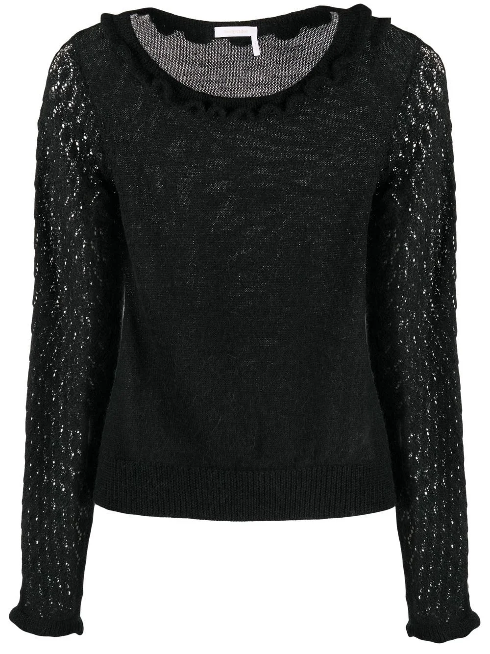 scalloped fine-knit top See By Chloe's AW22 collection brings a delicate approach to knitwear, as showcased by this black-hued top. Crafted from an alpaca wool blend, it boasts romantic detailing such as pointelle-knitted sleeves and a scalloped collar. Imported Composition Alpaca Wool 50%, Polyamide 45%, Wool 5% SIZE & FIT Model measurements Height 5 ft 11 in(1.8 m) Bust/Chest 31.49 in(80 cm) Hips 35.43 in(90 cm) Waist 25.19 in(64 cm) FittingInformation This piece fits true to size. We recommend you get your regular size Cut for a slim fit Made with a mid-weight fabric Washing instructions Dry Clean Only