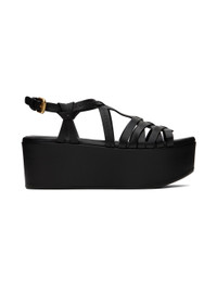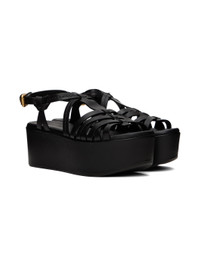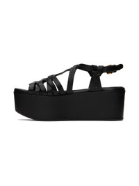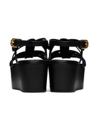 Buffed leather heeled sandals in black. · Open toe · Criss-crossing straps at vamp · Pin-buckle ankle strap · Logo embossed at padded footbed · Covered platform midsole · Rubber outsole · Platform: H2.5 in Supplier color: Black Upper: leather. Sole: rubber. Made in Spain 231373F125036