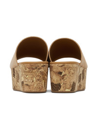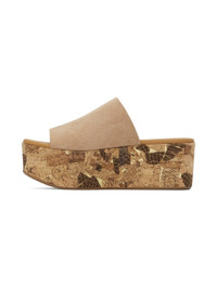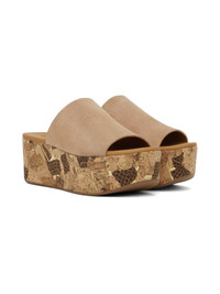 Calfskin suede slip-on sandals in tan. · Open toe · Logo embossed at padded calfskin footbed · Buffed calfskin lining · Graphic printed at cork platform midsole · Rubber sole · Platform: H2" Supplier color: Nude Upper: calfskin. Sole: rubber. Made in Spain 241373F124053
