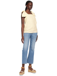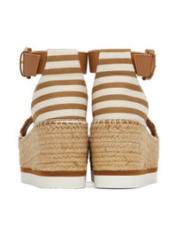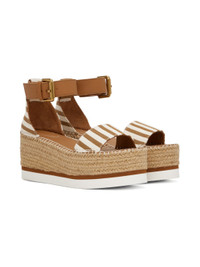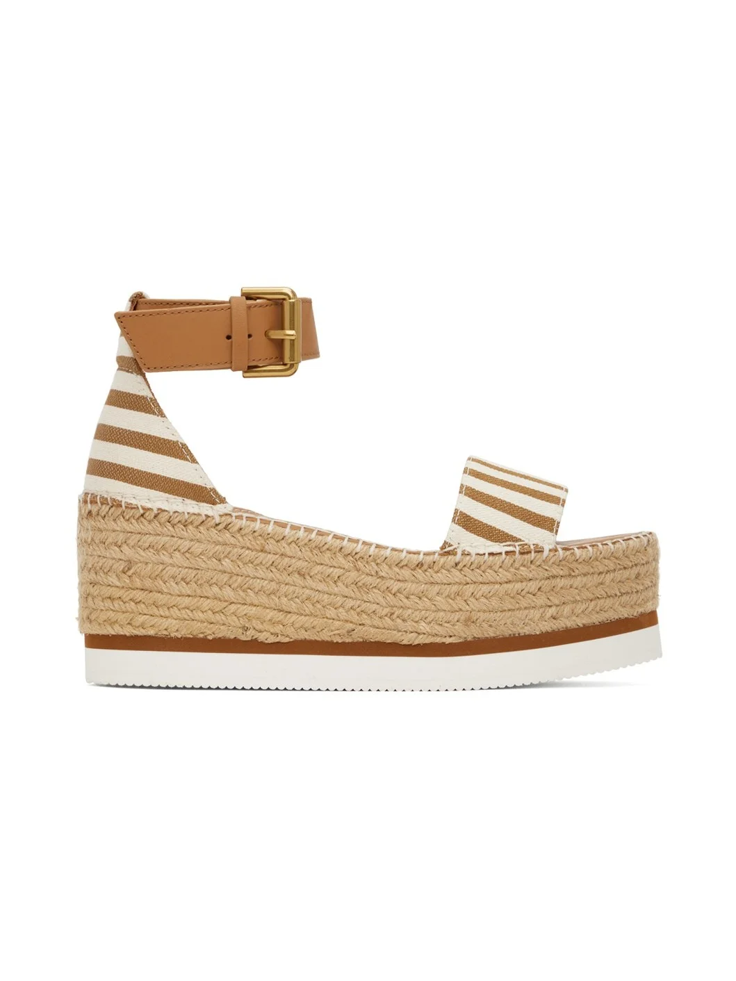 Canvas flat sandals in tan and white. · Open toe · Calfskin pin-buckle ankle strap · Buffed calfskin footbed · Blanket stitching at welt · Braided jute platform midsole · Treaded foam rubber sole · Platform: H2.25" Supplier color: Tan Upper: textile, calfskin. Sole: jute, rubber. Made in China 241373F124051