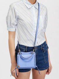 Tilda cross-body mini bag in smooth and suede cowhide with the line's signature braided trims and gold brass hardware. The See by Chloé medal brings an iconic finishing touch to this practical mini bag. PRODUCT DETAILS Cross-body mini bag in smooth & suede cowhide Carry: cross-body & long shoulder - 1 main compartment with magnetic snap button closure - 1 back zippered pocket - Removable handle - Adjustable & removable strap - Cotton canvas lining Comes with a dust bag - Width: 6.9" (17.5 cm) - Height: 6.3" (16 cm) - Depth: 4.5" (11.5 cm) - Min. strap drop: 17.7" (45 cm) - Max. strap drop: 22.4" (57 cm) This mini bag is made of velvet leather. To preserve its natural appearance and velvety feel, it has not been treated. As such, it is more sensitive to light, staining and color bleeding. Avoid prolonged contact with contrasting colored fabrics that may bleed (e.g. denim). Avoid rubbing the product against rough surfaces and protect it from sources of humidity/light/heat/liquid/grease. To make this product, Chloé worked with Leather Working Group (LWG) certified leather manufacturers. LWG certifies tanneries based on their water and energy usage, management of chemicals, solid waste, and wastewater. Color: Persian Blue Item code: CHS22ASA68C994C9