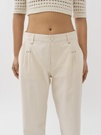 Cream white jeans crafted from organic cotton denim. Green topstitched pin-tuck detail elevates the cropped, tapered silhouette. PRODUCT DETAILS White denim cropped jeans main material: 100% cotton Care: Gentle wash at 90°F (30°C)/Reduced dry clean P Fit: Cropped, tapered - White denim jeans - Topstitched pin-tuck detail - Regular waist - Leather patch at the back - Front zipper and one button An organic cotton farming system sustains the health of soils, ecosystems and people by eliminating the use of toxic and persistent organic pollutants and increasing water conservation. Color: Antique White Item code: CHS23SDP06161116