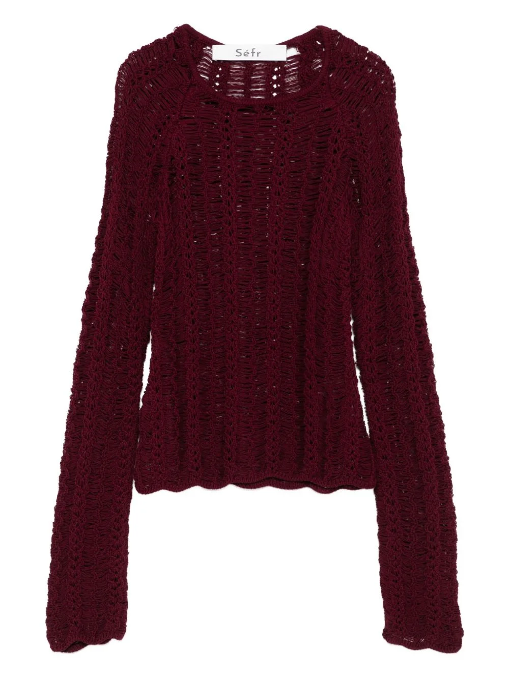 open-knit sweater Highlights - Burgundy - Open knit - Long sleeves - Round neck - Crochet design Imported Composition Cotton 100% SIZE & FIT Model measurements Height 5 ft 9 in(1.75 m) Bust/Chest 32.67 in(83 cm) Hips 36.22 in(92 cm) Waist 24.8 in(63 cm) Washing instructions Hand Wash