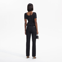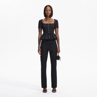 Classically romantic with a dose of vintage charm, this stunner of a top is cut from black bouclé for its rich texture and tailored feel. It has a suits-all square neckline, which tops a row of tonal buttons and a flattering full peplum. Pair it with jeans for a timeless date night look, or switch to a full midi skirt for a silver screen-worthy evening ensemble. Check the Size Guide to find your perfect fit. COMPOSITION Main Fabric: 86% Polyester 5% Metallised Fibre 4% Cotton 3% Viscose 1% Acrylic 1% Polyamide Lining: 100% Polyester