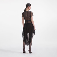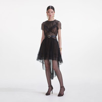 Details & Fit See and be seen in this black dot mesh dress, oozing with barely-there appeal. Lace panelling and a bow motif add sensual detail – show off its dramatic hemline with a pair of sky-high platforms. - Fitted style, take one size up if between sizes - This style has minimal stretch - Zip closure at back - Lace panelling at bodice - Removable belt - Model is 5ft10/178cm and wears a size uk 6 COMPOSITION Main Fabric 1: 100% Polyester Main Fabric 2: 100% Polyamide Lace Trim 1: 100% Polyamide Lace Trim 2: 100% Polyamide Lining 1: 100% Polyester Lining 2: 100% Polyester Lining 3: 100% Polyamide Belt: Face: 100% Leather Belt Backing: 100% Polyamide