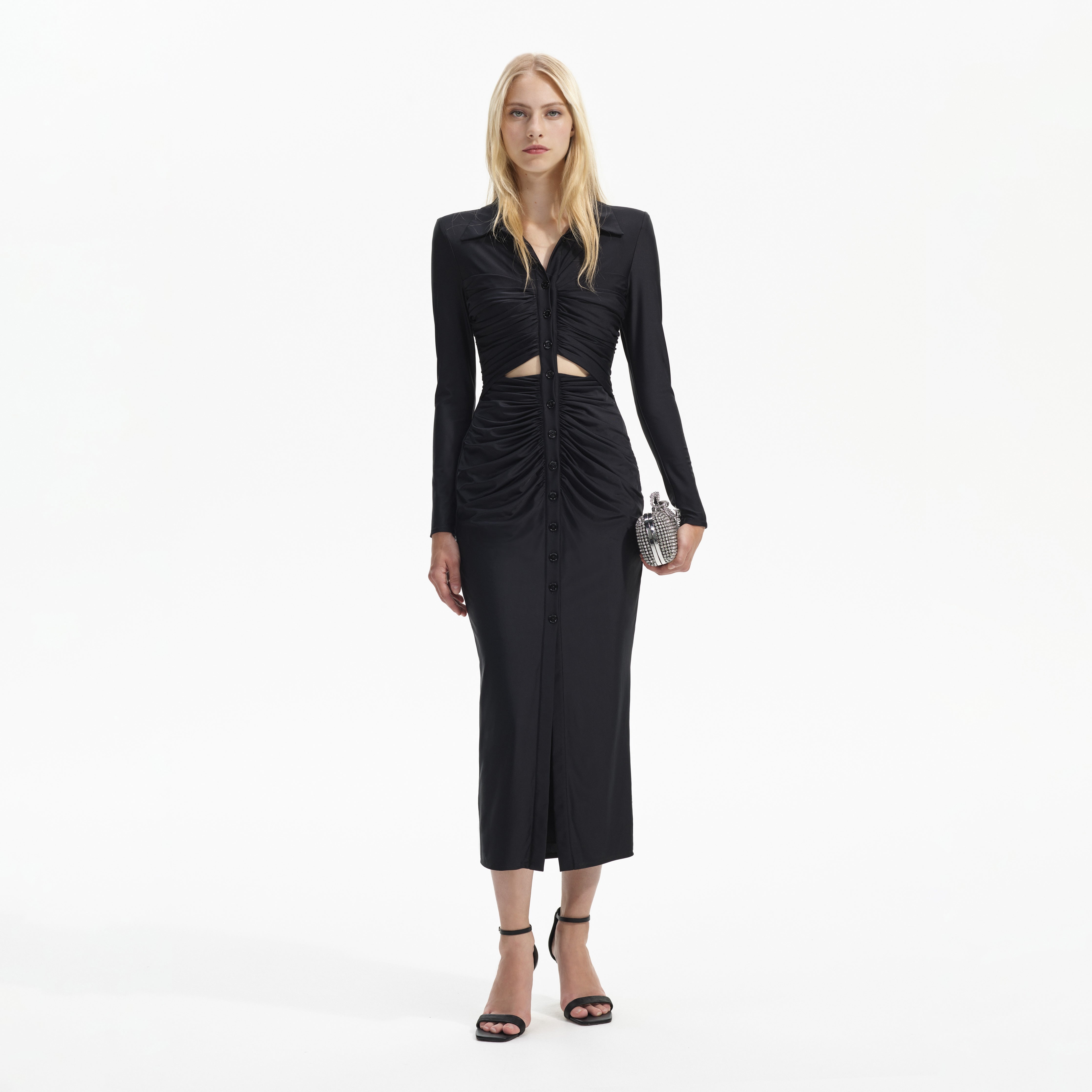 A masterclass in balancing ease and sophistication, this dress is cut from black jersey for its soft drape and substantial stretch. It puts a twist on a shirting-inspired collar and button-down design with the help of figure-hugging ruching and cut-outs, which give it a party-ready touch. Pair it with knee-high boots and a blazer for drinks with the girls. Check the Size Guide to find your perfect fit. COMPOSITION Main Fabric: 80% Polyamide 20% Elastane Lining: 80% Polyamide 20% Elastane