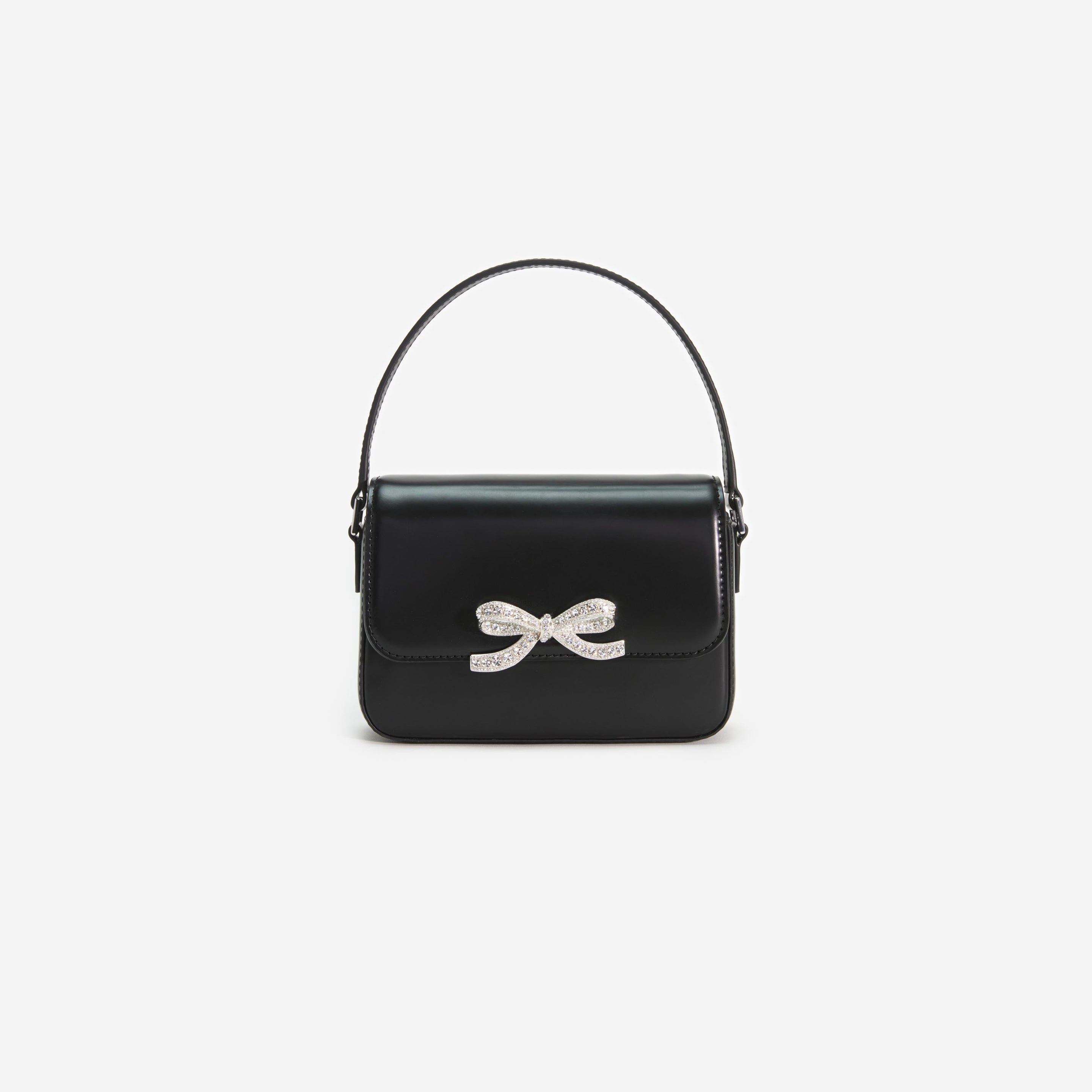 Details & Fit A timeless silhouette meets our statement diamanté bow in this micro bag crafted entirely from 100% black leather. Designed to fit all the essentials, the compact design fastens with a magnetic flap closure. COMPOSITION 100% Bovine Leather