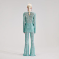 These statement trousers are cut from aquamarine beaded fishnet, with a flattering flared hem that elongates the legs. Layered over your favourite swim pieces, they will look just as stunning poolside as they do on the dancefloor. Pair with the matching cardigan and statement heels for extra impact. Consult the Size Guide to find your perfect fit. COMPOSITION Main Fabric : Ground Fabric : 95% Polyamide 5% Metallised Fibre Connective Yarn 1: 100% Polyamide Connective Yarn 2 : 100% Polyester (Exclusive Of Decoration) Lining :87% Polyester 13%Elastane