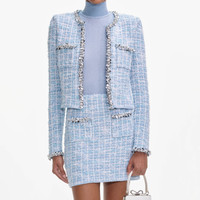 Details & Fit Ultra feminine with a touch of glitz, this blue knit jacket features a fitted cut and sparkling sequin trims. Pair with the matching skirt and our statement earrings for a ritzy afternoon tea. - True to size - Fabric has stretch - Button closure at front - Removable shoulder pads - Functional pockets - Model is 5ft10/178cm and wears a size M COMPOSITION Main: 71% Polyester 26% Viscose 3% Polyamide (Exclusive Of Decorative Sequins)