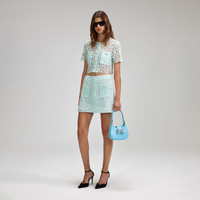 Cut from daisy guipure lace in a mood-lifting shade of mint green, this skirt is an effortless shortcut to a polished look. Lined with diamanté pearl buttons for their photo-ready shine, it has a flattering high-waisted cut and curved hemline, as well as nifty pockets. Wear it to brunch with the girls with a matching Bow Bag. Consult the Size Guide to find your perfect fit. COMPOSITION Main Fabric: 100% Polyester Lining: 100% Polyester Trim: 100% Polyester