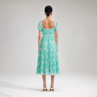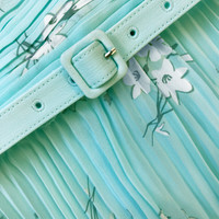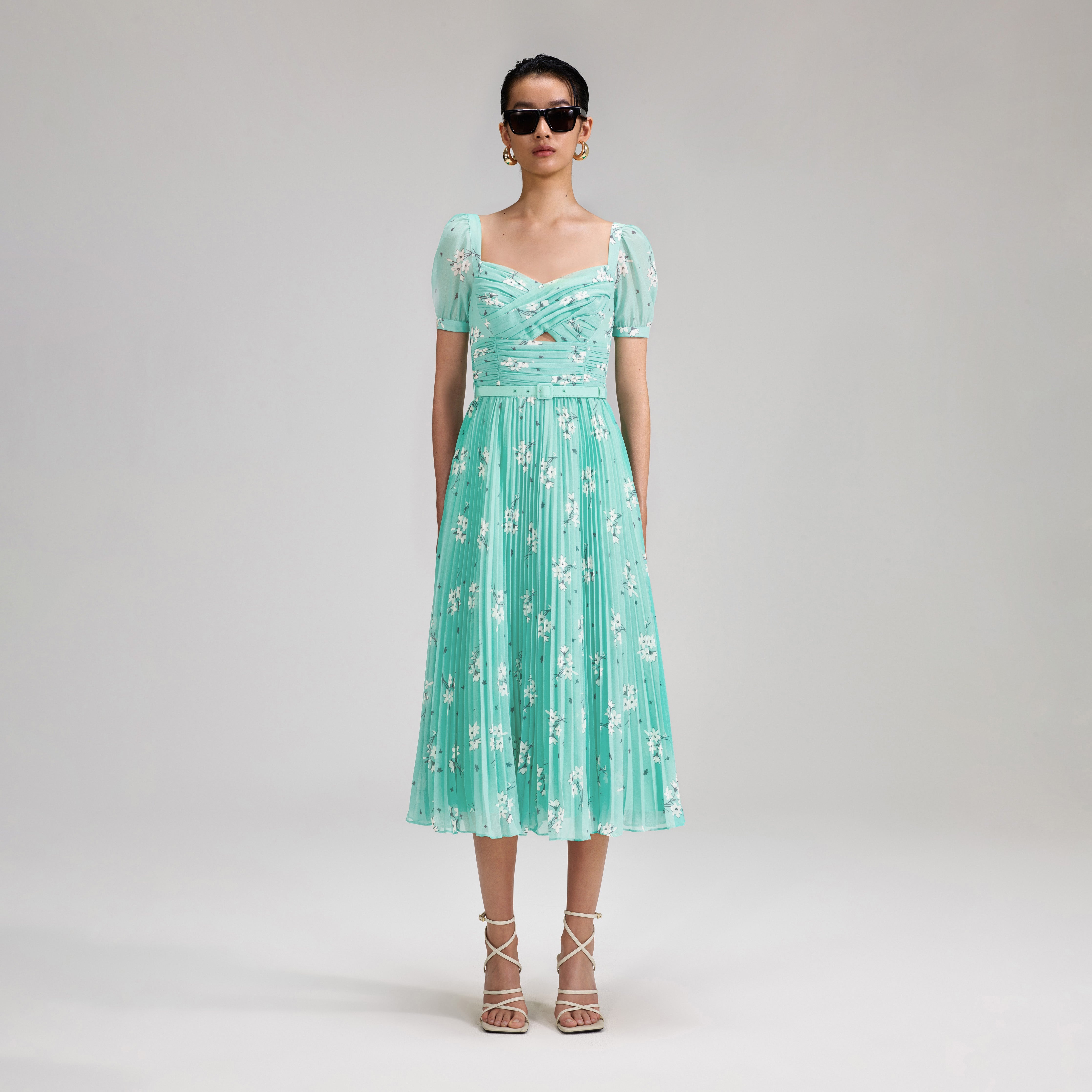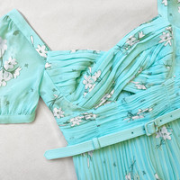 Cut from blue floral chiffon for an effortlessly ethereal feel, this dress is ideal for garden parties and al fresco lunches. A flattering sweetheart-neckline frames a wrapped bodice with a subtle cut-out, while a tonal belt cinches in above a twirl-ready pleated skirt. Pair it with espadrilles for the perfect spring look, and check the Size Guide to find your perfect fit. COMPOSITION Main Fabric: 100% Polyester Lining: 100% Polyester Belt: 100% Polyester