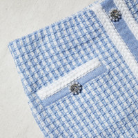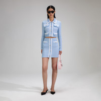 The cosy comfort of a great knit meets a party-ready look in this blue skirt, which is cut from lurex knit for a stretchy fit and shimmering finish. The flattering high-waisted and sculpted silhouette is highlighted by contrast braided trims, and diamanté buttons give it an elevated appeal. Make it a total look with our matching cardigan and check the Size Guide to find your perfect fit, COMPOSITION Mian: 72% Viscose 14% Polyester 9% Polyamide 5% Metallised Fiber Trim: 100% Polyester