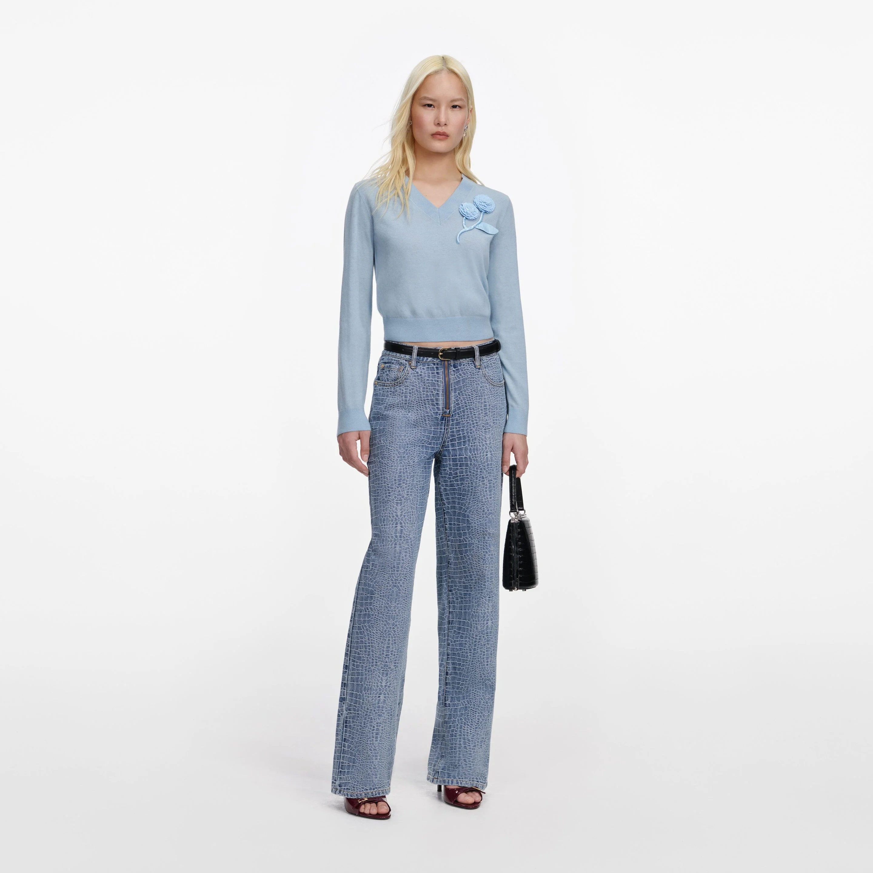 Details & Fit A closet staple gets a romantic upgrade in this blue wool cashmere knit, which boasts a sculptural floral motif. Pair with denim for off-duty chic or style with a midi for meetings that matter. - True to size - Fabric has stretch - Relaxed fit - V neckline - Sculptural floral motif - Model is 5ft10/178cm and wears a size S Composition Main: 92% Wool 8% Cashmere Trim: 77% Wool 15% Polyamide 7% Cashmere 1% Elastane (Exclusive Of Decorations)