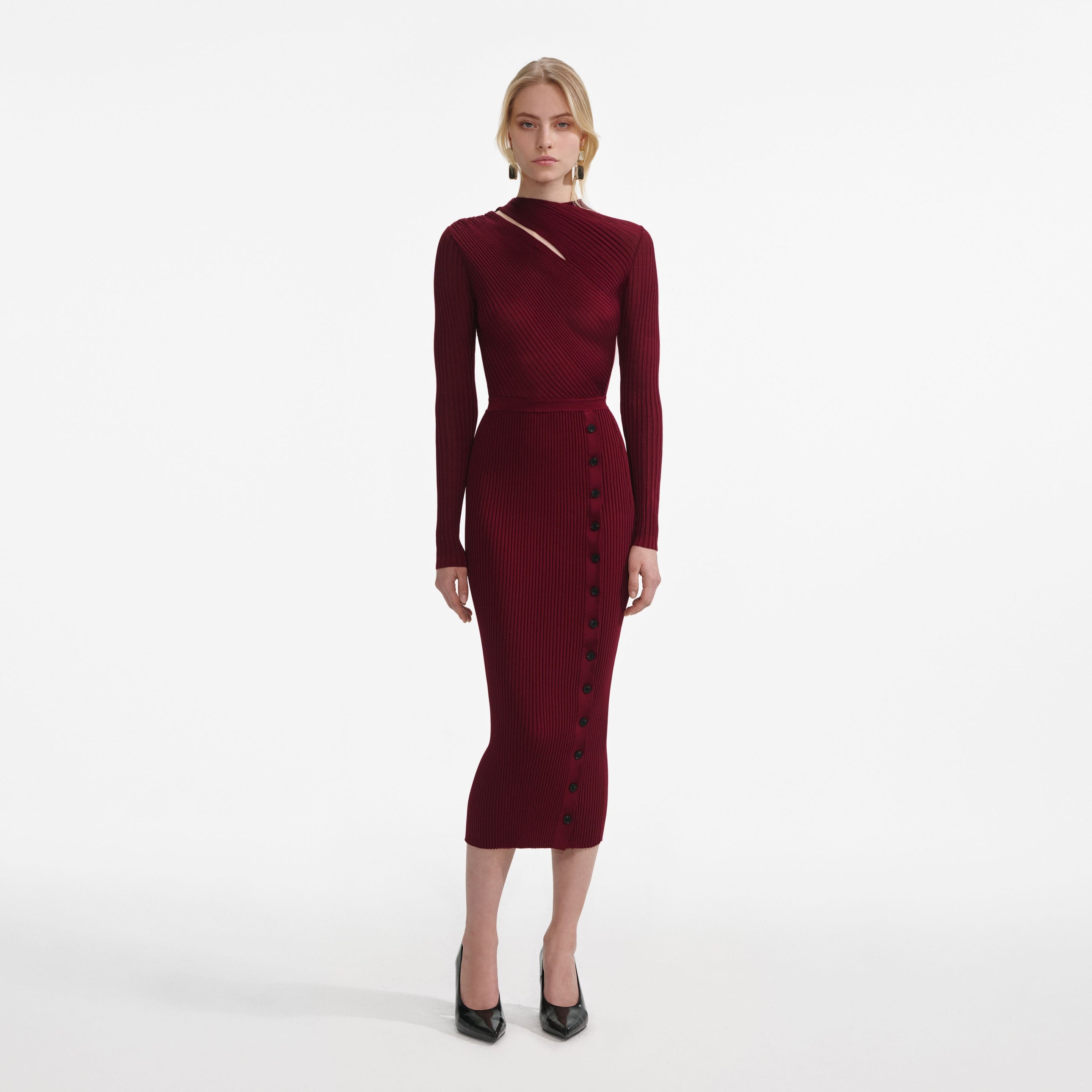 Details & Fit Cut from ribbed knit, this midi dress exudes sensual intrigue with its cut-out detailing and draped shoulder feature, whilst buttons on the skirt allow the slit to be customised as high as you want.Cut from ribbed knit, this midi dress exudes sensual intrigue with its cut-out detailing and draped shoulder feature, whilst buttons on the skirt allow the slit to be customised as high as you want. - True to size - Fabric has stretch - Unlined style - Cut-outs at front - Button closure at skirt split - Model is 5ft10/178cm and wears a size S - True to size - Fabric has stretch - Unlined style - Cut-outs at front - Button closure at skirt split - Model is 5ft10/178cm and wears a size S COMPOSITION Upper Body: 100% Viscose Lower Body: 62% Viscose 38% Polyester (Exclusive Of Trimmings) Upper Body: 100% Viscose Lower Body: 62% Viscose 38% Polyester (Exclusive Of Trimmings)