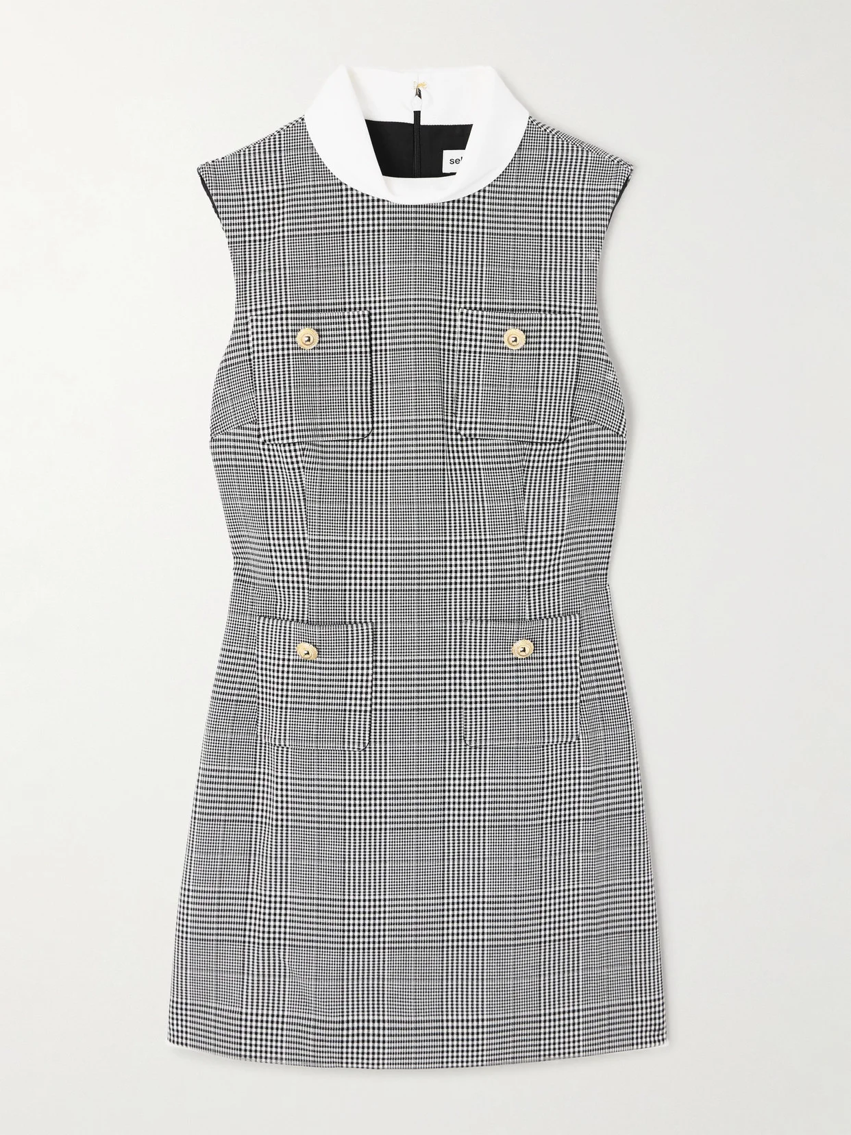 Self-Portrait is skilled at modernizing sophisticated, retro styles in such fresh and innovative ways. This mini dress is made from tweed in a classic Prince of Wales checked motif and has gold-tone buttons at the patch pockets. The contrasting collar enhances the chic feel.