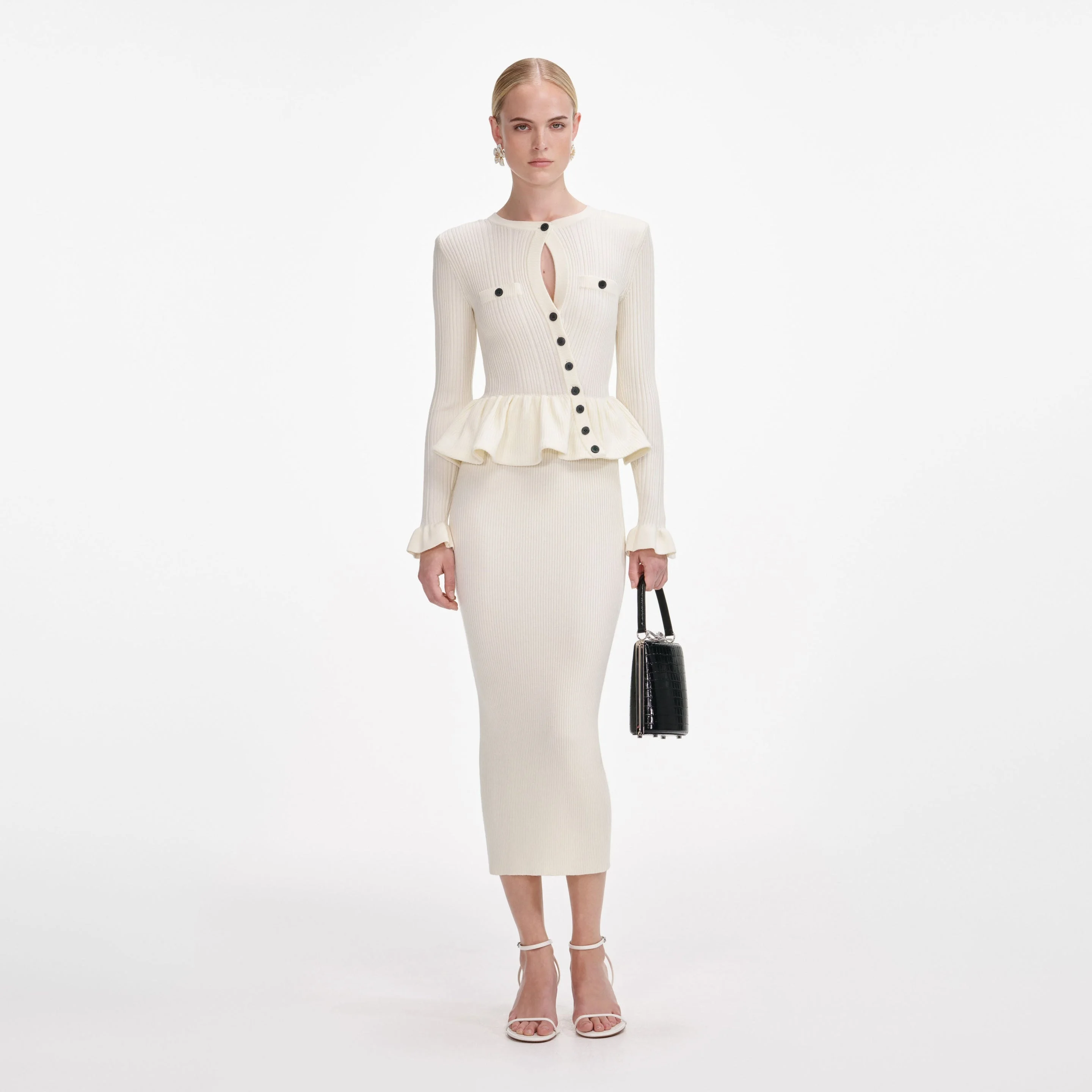 Details & Fit This cream cashmere knit dress is a soft, luxurious hug around the body. A keyhole cut-out, peplum waist and asymmetric buttons accent its sculpting silhouette. Frill cuffs are the cherries on top. This cream cashmere knit dress is a soft, luxurious hug around the body. A keyhole cut-out, peplum waist and asymmetric buttons accent its sculpting silhouette. Frill cuffs are the cherries on top. - True to size - Fabric has stretch - Button closure down front - Keyhole cut-out - Removable shoulder pads - Model is 5ft10/178cm and wears a size S - True to size - Fabric has stretch - Button closure down front - Keyhole cut-out - Removable shoulder pads - Model is 5ft10/178cm and wears a size S COMPOSITION Main: 83% Wool 17% Polyester (Exclusive Of Trimmings) Main: 83% Wool 17% Polyester (Exclusive Of Trimmings)