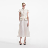 Details & Fit A lesson in elegant contrasts, this dress marries the soft structure of cream tailored boucle with a featherweight pleated midi skirt. 3D floral decorations on the pockets are the cherries on top. COMPOSITION Main 1: 59% Acrylic 31% Polyester 10% Polyamide Main 2: 100% Polyester Lining 1: 100% Polyester Lining 2: 100% Polyester