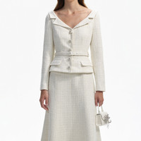 Details & Fit A timeless take on a house signature, this dress is cut from bouclé for its soft structure. An off-shoulder detail offers a new twist — ideal for bridal events and festive cocktails alike. COMPOSITION Main Fabric : 100% Polyester Belt : 100% Polyester Lining : 100% Polyester