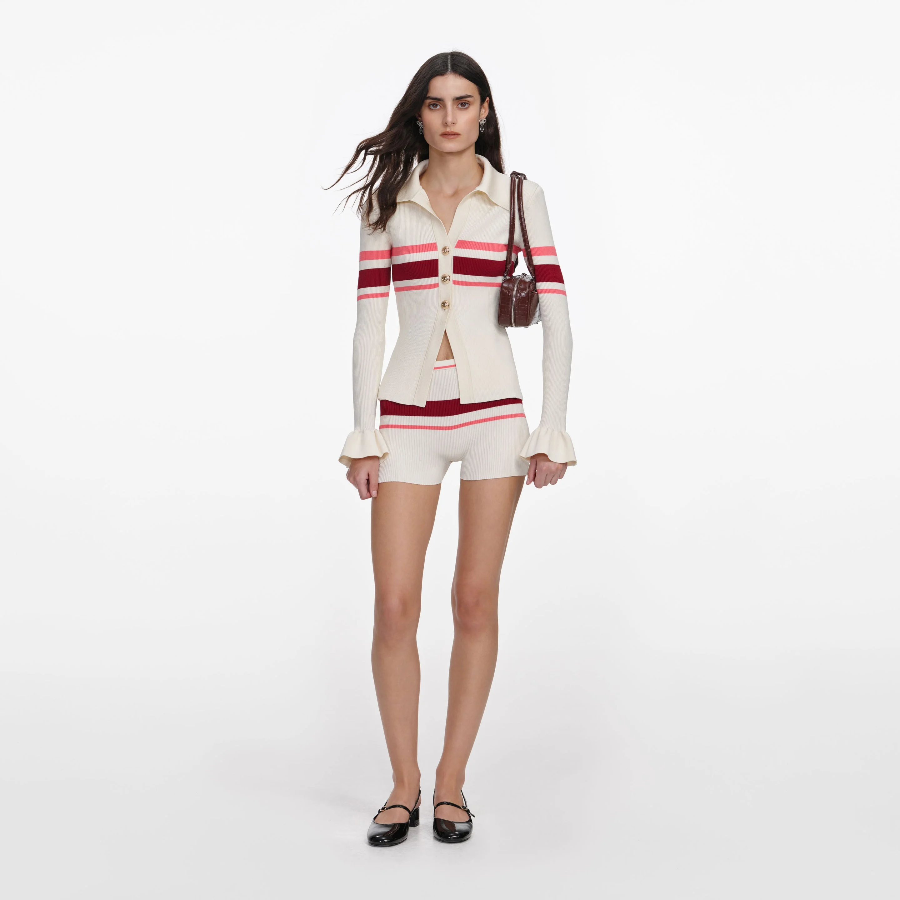 Details & Fit Stay on track: sporty stripes bring vintage athletic flair to this cream knit cardigan. Accented with gold buttons for extra prep and polish, make it a stylish staple of your everyday wardrobe. - True to size - Fabric has stretch - Button closure down front - Gold button detailing - Matching shorts available - Model is 5ft10/178cm and wears a size S Composition Main: 50% Viscose 32% Polyester 16% Polyamide 2% Elastane Trim: 78% Viscose 22% Polyester (Exclusive Of Trimmings)