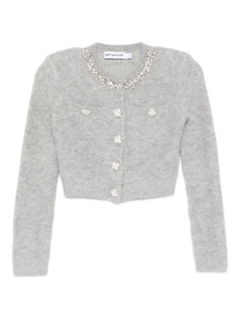 crystal-embellished cardigan Highlights - Grey - Crystal embellishment - Round neck - Long sleeves - Two front patch pockets Imported Composition Polyester 45%, Polyamide 32%, Alpaca 15%, Wool 5%, Metallised Fibres 2%, Elastane 1% SIZE & FIT Model measurements Height 5 ft 10 in(1.78 m) Bust/Chest 31.49 in(80 cm) Hips 37 in(94 cm) Waist 23.62 in(60 cm) Washing instructions Dry Clean Only