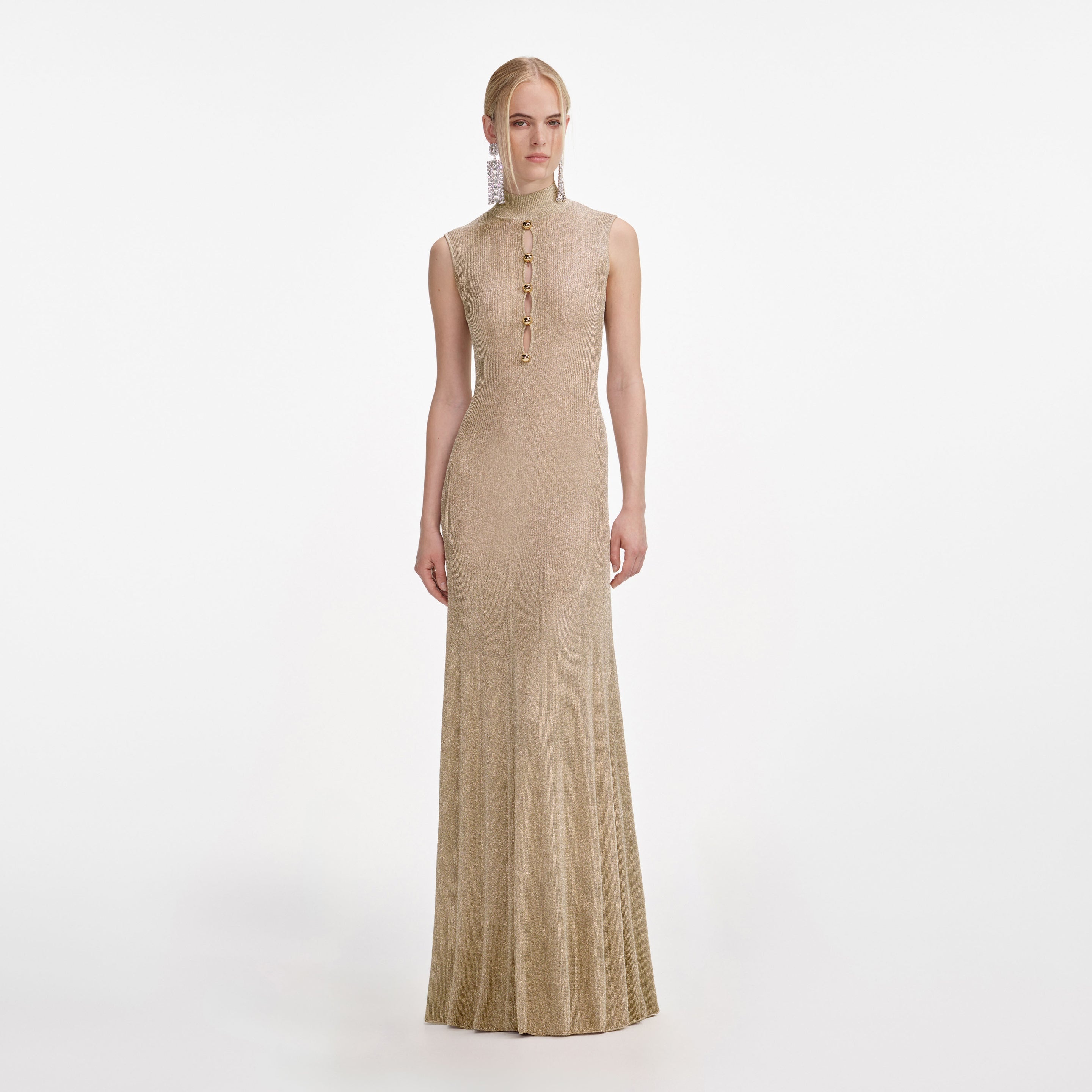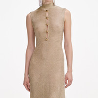 Details & Fit Knitted with lurex for a golden finish, this midi dress unites sensuality with comfort. Gold buttons accent the daring keyhole cut-outs at the front – wear with stilettoes to make an entrance. Knitted with lurex for a golden finish, this midi dress unites sensuality with comfort. Gold buttons accent the daring keyhole cut-outs at the front – wear with stilettoes to make an entrance. - True to size - Fabric has stretch - Button closure down front - Unlined style - Deep cut-out at front - Model is 5ft10/178cm and wears a size S - True to size - Fabric has stretch - Button closure down front - Unlined style - Deep cut-out at front - Model is 5ft10/178cm and wears a size S COMPOSITION 69% Viscose 31% Metallised Fibre (Exclusive Of Trimmings) 69% Viscose 31% Metallised Fibre (Exclusive Of Trimmings)