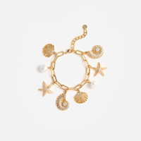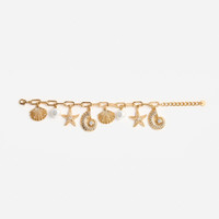 Details & Fit The seaside is calling with this gold charm bracelet, dangling with playful starfish, shells and pearls. Use it to dress up a daytime look or wear it with a slinky slip dress for sundowners.The seaside is calling with this gold charm bracelet, dangling with playful starfish, shells and pearls. Use it to dress up a daytime look or wear it with a slinky slip dress for sundowners. - Gold plated brass - Crystal and faux pearl embellishment - Clasp fastening - Length: 19.3cm Height: 2.15cm - Gold plated brass - Crystal and faux pearl embellishment - Clasp fastening - Length: 19.3cm Height: 2.15cm COMPOSITION Brass + Zirconia + ABS Pearl Brass + Zirconia + ABS Pearl