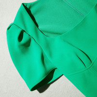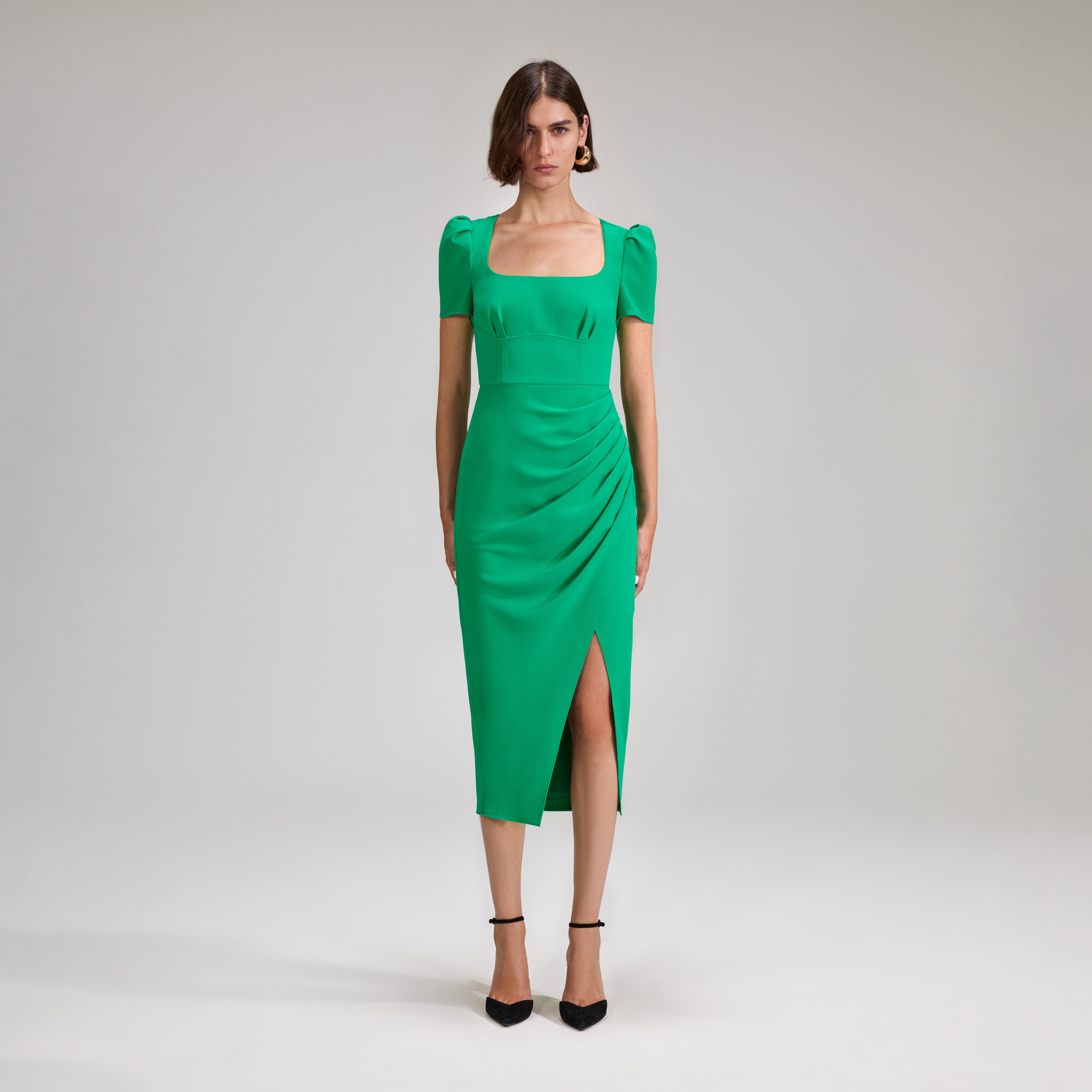 Crafted from emerald-hued heavy crepe for its comfortable feel and effortless drape, this dress is a real gem. Its fitted bodice is endlessly flattering, with a square neckline and puffed sleeves. The draped skirt highlights the figure, and features a split for both ease of movement and a leg-lengthening effect. Wear it to work drinks or a night out and check the Size Guide to find your perfect fit. COMPOSITION Main Fabric: 100% Polyester Lining: 100% Polyester