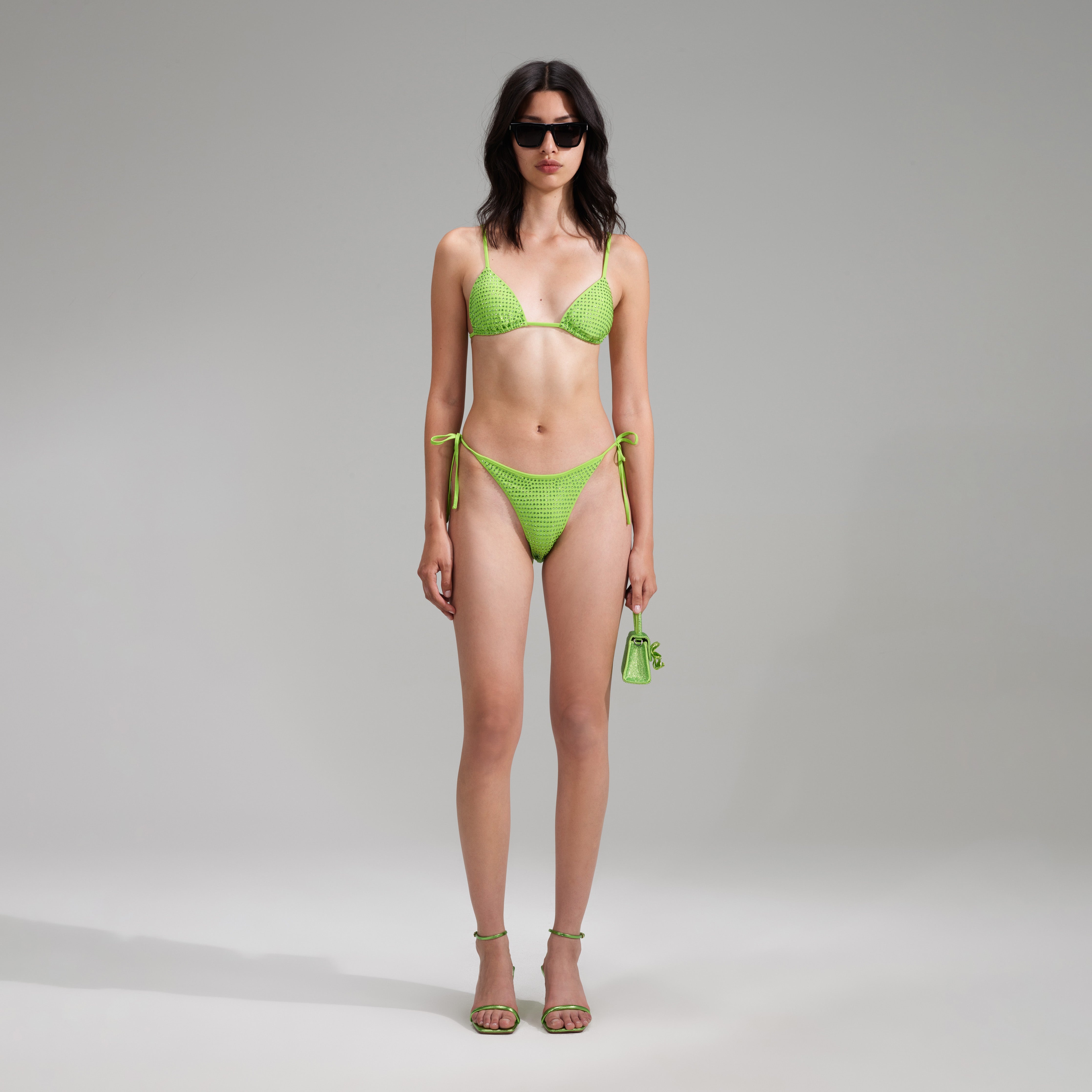 Up your swimwear game with these lime green briefs, which are cut from rhinestone swim fabric for disco-worthy shine. They have a flattering brazilian fit to flatter your form, and are framed by waist ties for minimal tan lines. Pair them with our matching bikini top and a crochet cover-up for some poolside glamour. Check the Size Guide to find your perfect fit. COMPOSITION Main Fabric: 80% Polyamide 20% Elastane Lining: 80% Polyamide 20% Elastane