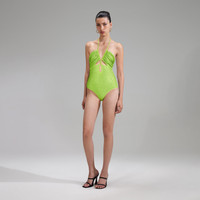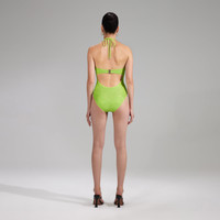Cut from crystal-studded swim jersey for comfort and shine, this lime green one piece has it all. It has a versatile halterneck, a cut-out bodice and an open back, ruched throughout for flattering definition. Pair it with chunky sandals and oversized sunglasses for a 90s inspired pool day look. Check the Size Guide to find your perfect fit. COMPOSITION Main Fabric: 80% Polyamide 20% Elastane Lining: 80% Polyamide 20% Elastane