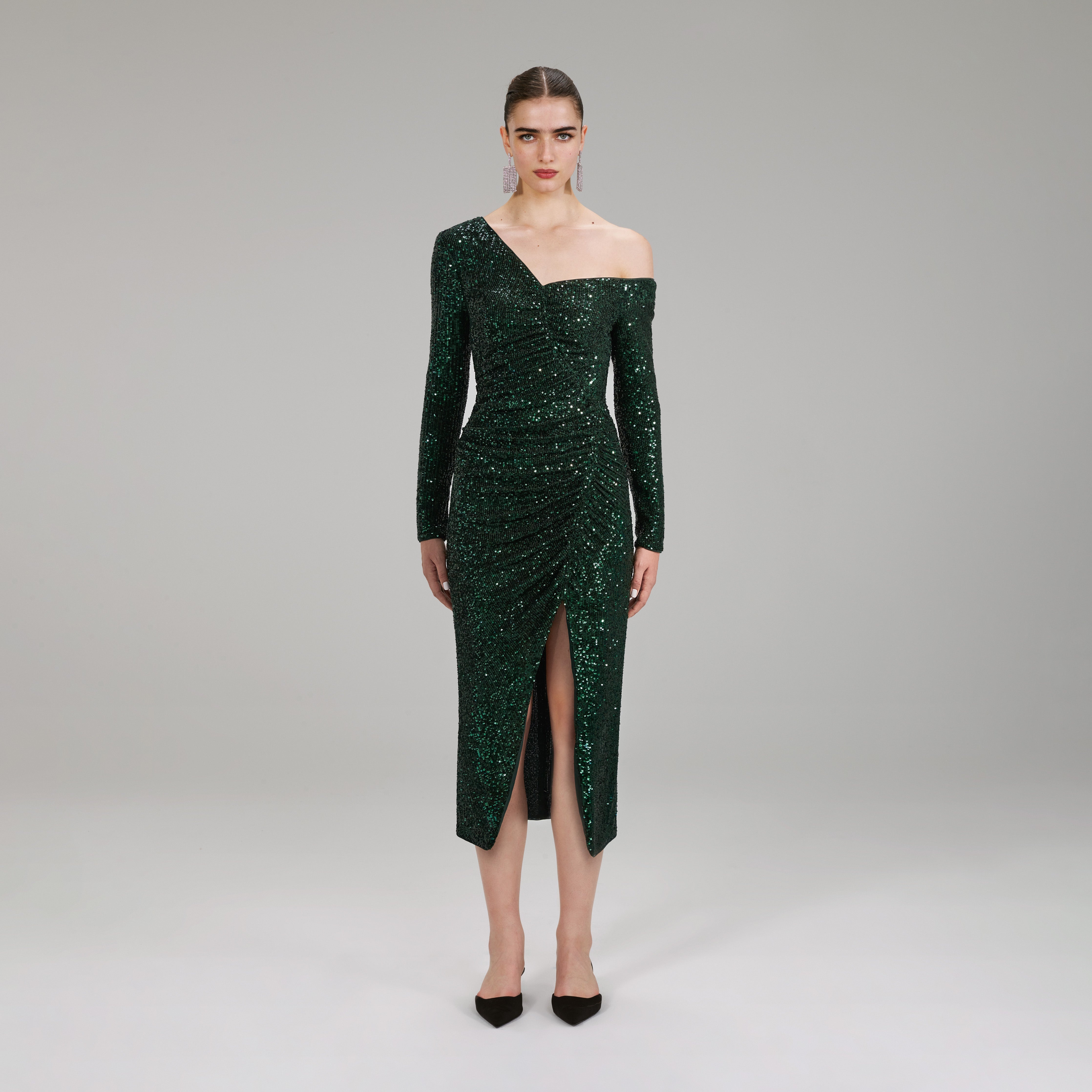 Parties were made for dresses like this one, which was cut from stretchy sequinned fabric for a liquid-like sculpted fit. It has an asymmetrical off shoulder neckline and gathering throughout its body-hugging midi silhouette, as well as a leg-lengthening side split for ease. Pair it with heels to dance the night away. Check the Size Guide to find your perfect fit. COMPOSITION Main Fabric: 95% Polyestser 5% Elastane Lining: 85% Polyester 15% Elastane