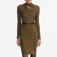 Details & Fit Realised in khaki ribbed knit for a sculpted fit, this mini dress boasts a keyhole cut-out, gathering details and adjustable button opening at the skirt slit. Add ballet flats for everyday chic. Realised in khaki ribbed knit for a sculpted fit, this mini dress boasts a keyhole cut-out, gathering details and adjustable button opening at the skirt slit. Add ballet flats for everyday chic. - True to size - Fabric has stretch - Slightly sheer - Unlined style - Cut-out at shoulder - Model is 5ft10/178cm and wears a size S - True to size - Fabric has stretch - Slightly sheer - Unlined style - Cut-out at shoulder - Model is 5ft10/178cm and wears a size S COMPOSITION Upper Body: 100% Viscose Lower Body: 62% Viscose 38% Polyester Upper Body: 100% Viscose Lower Body: 62% Viscose 38% Polyester