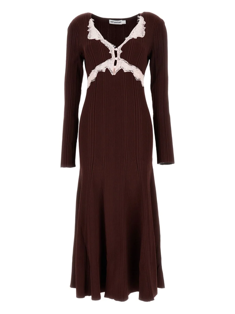 ribbed lace A-line dress Highlights - Brown - Ribbed knit - Lace detail - A-line silhouette - Long sleeves Imported Composition Viscose 50%, Polyester 32%, Polyamide 16%, Spandex/Elastane 2%