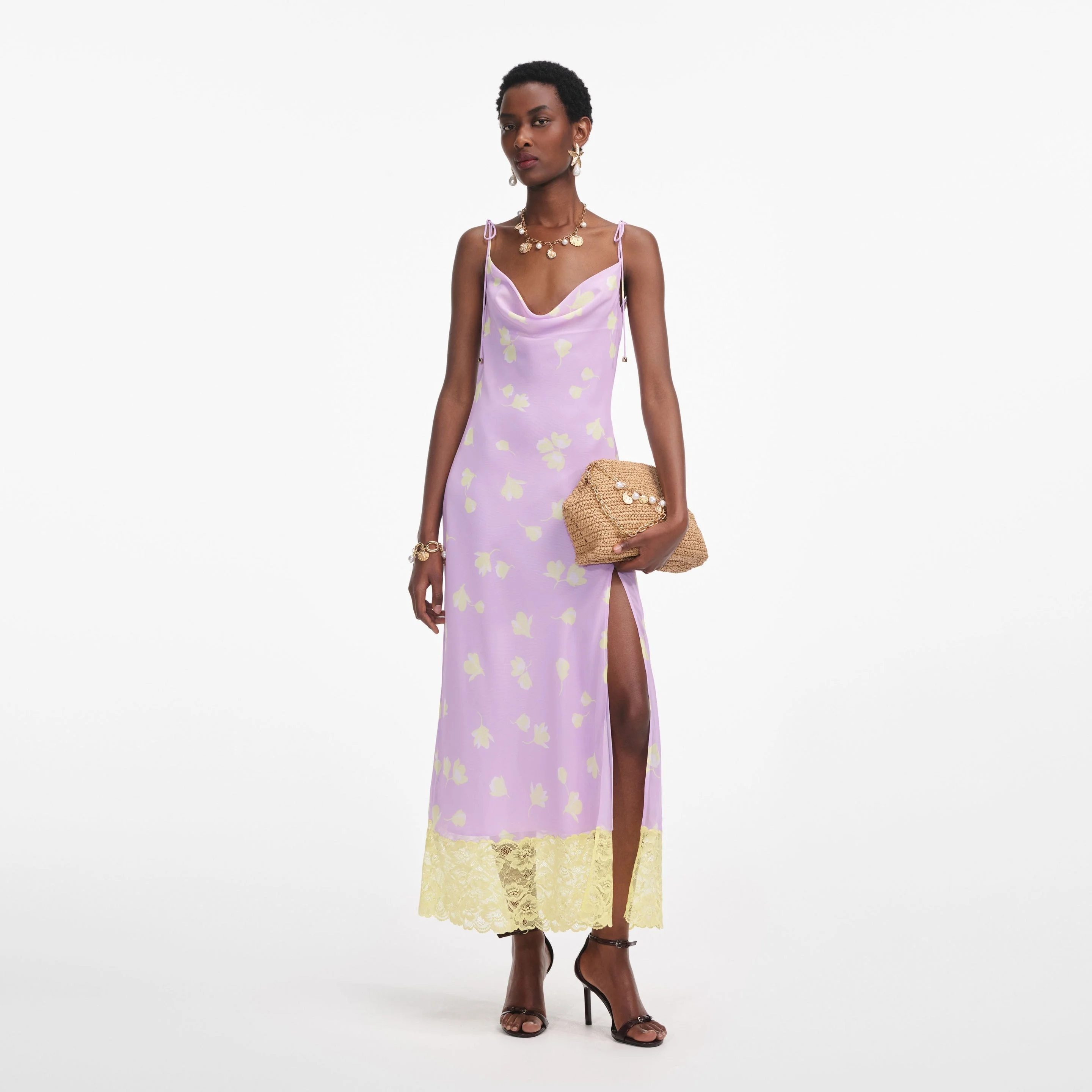 Details & Fit Floral lilac chiffon and a contrast yellow lace trim unite to vibrant effect in this midi dress. A cowl neckline and skirt slit add sensual details – pair with heels for parties and weddings alike. - True to size - Fabric has stretch - Racerback detailing - Internal bodysuit with popper closure at gusset - Plunging side seams - Model is 5ft10/178cm and wears a size UK 6 Composition 100% Polyester
