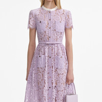 Details & Fit A vision of elegance, our signature lace dress comes reimagined in a dreamy lilac hue. Belted at the waist for a fit-and-flare silhouette, style with statement heels for an invite-only occasion.A vision of elegance, our signature lace dress comes reimagined in a dreamy lilac hue. Belted at the waist for a fit-and-flare silhouette, style with statement heels for an invite-only occasion. - Fitted style, take one size up if between sizes - This style has minimal stretch - Button closure down front - Detachable cami lining - Removable belt - Model is 5ft10/178cm and wears a size UK 6 - Fitted style, take one size up if between sizes - This style has minimal stretch - Button closure down front - Detachable cami lining - Removable belt - Model is 5ft10/178cm and wears a size UK 6 COMPOSITION Main Fabric: 70% Polyamide 30% Cotton Trim Fabric: 100% Polyester Belt: 100% Polyester Detachable Lining: 100% Polyester Main Fabric: 70% Polyamide 30% Cotton Trim Fabric: 100% Polyester Belt: 100% Polyester Detachable Lining: 100% Polyester