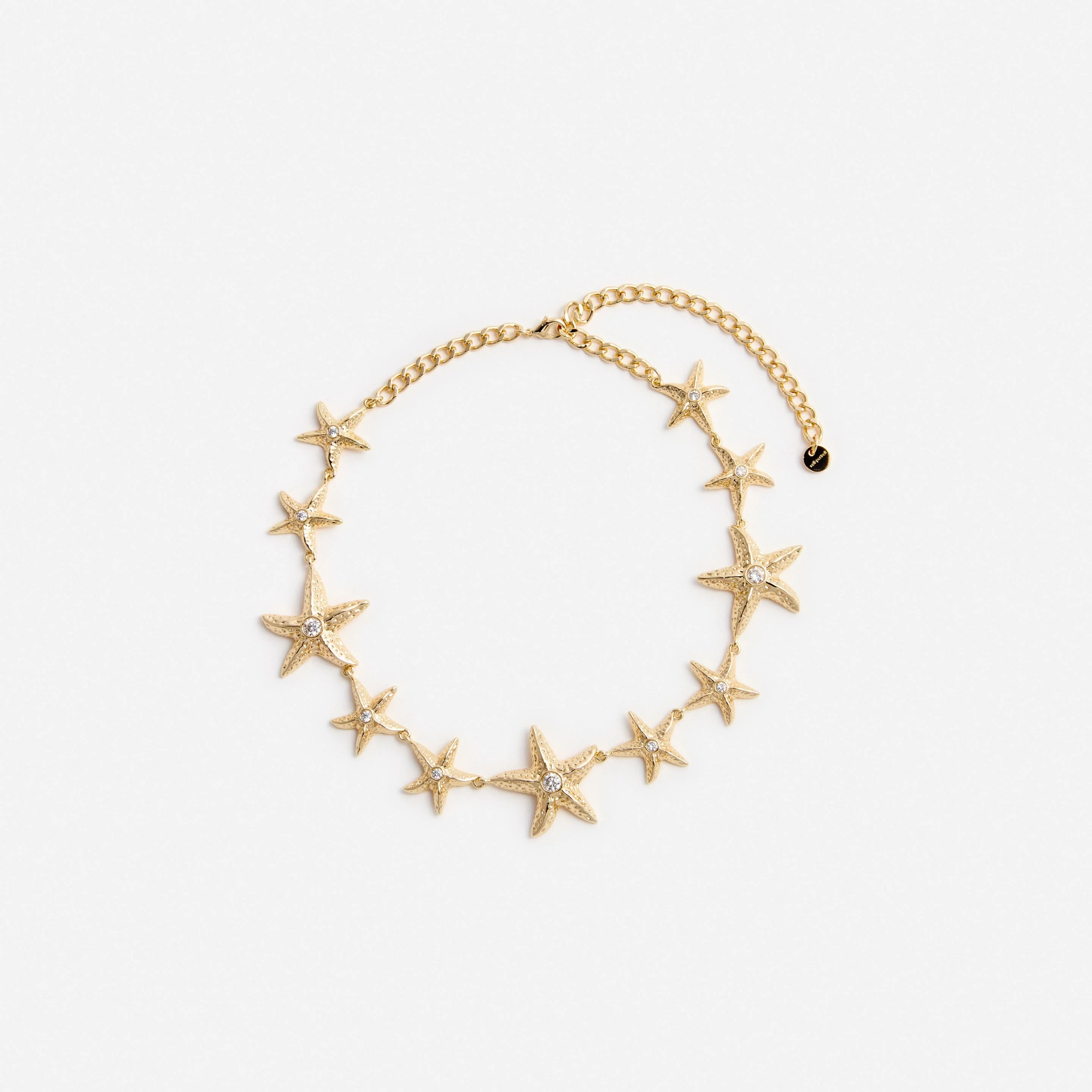 Details & Fit Encircled with gold starfish in varying sizes, this necklace adds nautical charm to every ensemble. Shining crystal centres bring extra shine – pair with light knits and slinky slip dresses alike. - Gold plated brass - Crystal embellishment - Clasp fastening - Length: 40cm (excluding chain) Height: 2.29cm Composition Brass + Zirconia