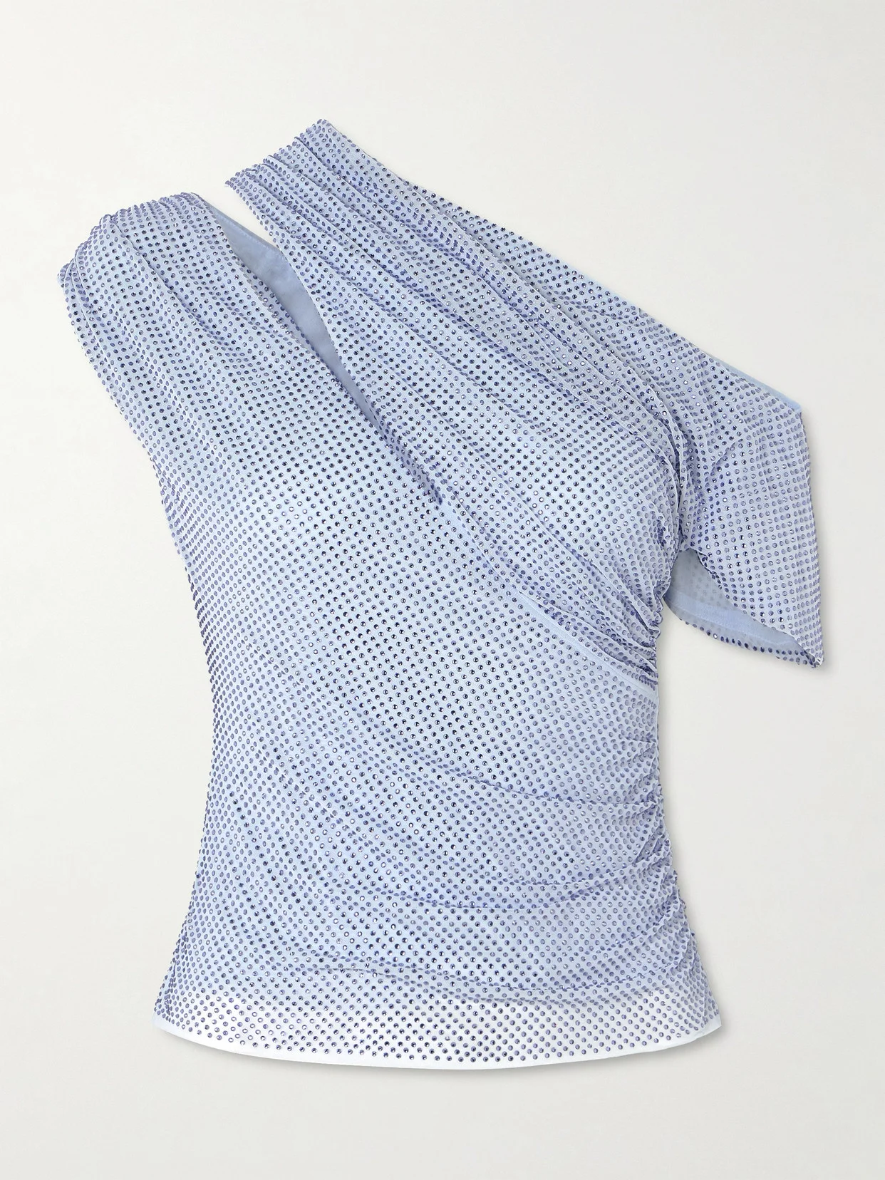One-shoulder Asymmetric Crystal-embellished Mesh Top