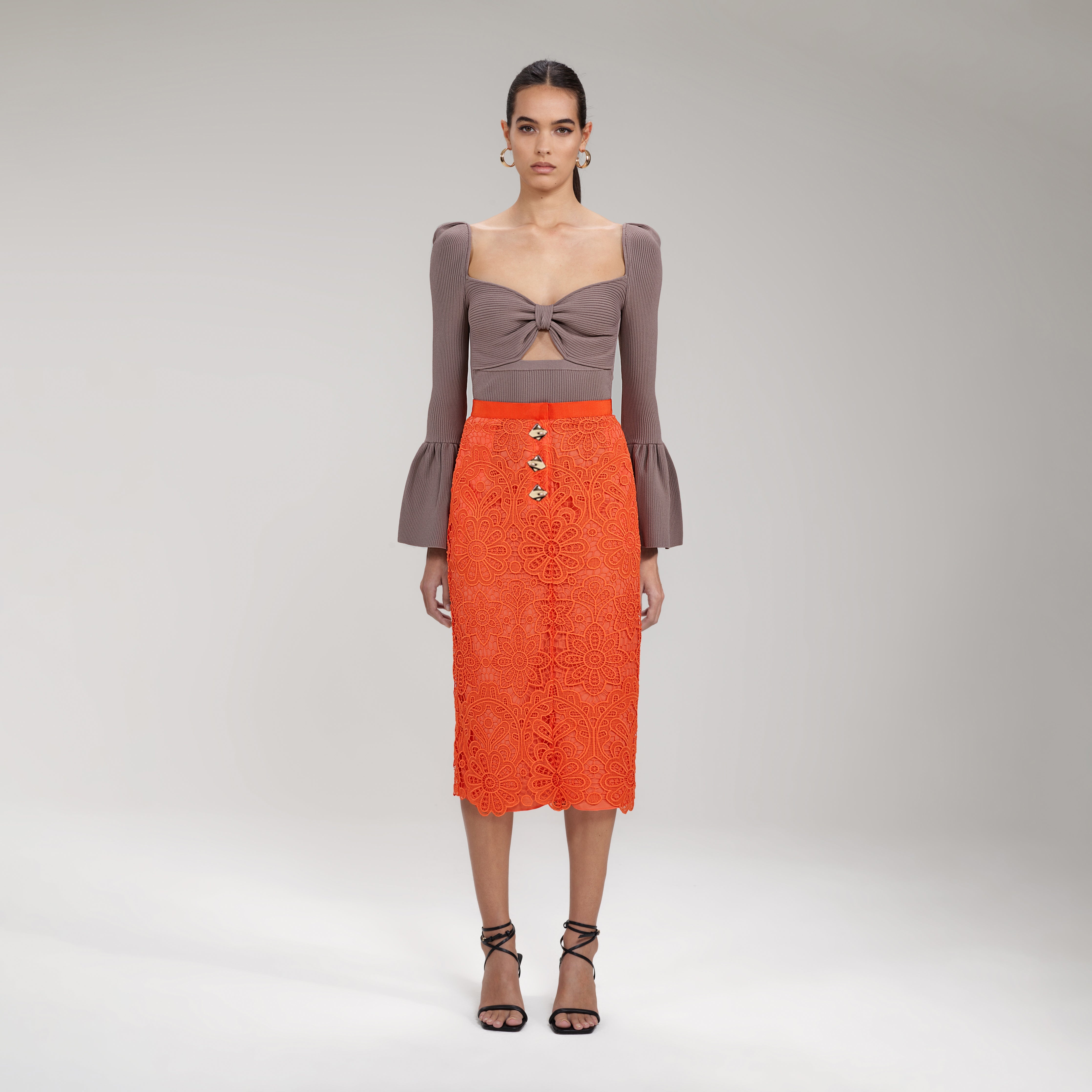 Give your favourite lace skirt a technicolour upgrade with this tropical-hued style. Cut from our signature floral guipure lace, it features abstract gold buttons and an ultra-flattering midi silhouette — perfect for layering under cosy knits in the cooler months, and pairing with our matching crop top on holiday for an eye-catching burst of colour. Check the Size Guide to find your perfect fit. COMPOSITION Main Fabric: 100% Polyester Lining: 100% Polyester Waistband: 92% Polyester 8% Elastane