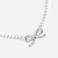 Details & Fit Ladylike pearls meets a sparkling bow in this elegant necklace. Style it with a minimalist gown for maximum impact, or use it to dress up an off-duty ensemble.Ladylike pearls meets a sparkling bow in this elegant necklace. Style it with a minimalist gown for maximum impact, or use it to dress up an off-duty ensemble. - Silver plated brass - Faux Pearl and crystal embellishment - Clasp fastening - Length: 42.2cm Height: 3cm - Silver plated brass - Faux Pearl and crystal embellishment - Clasp fastening - Length: 42.2cm Height: 3cm COMPOSITION Faux Pearl, Brass Faux Pearl, Brass