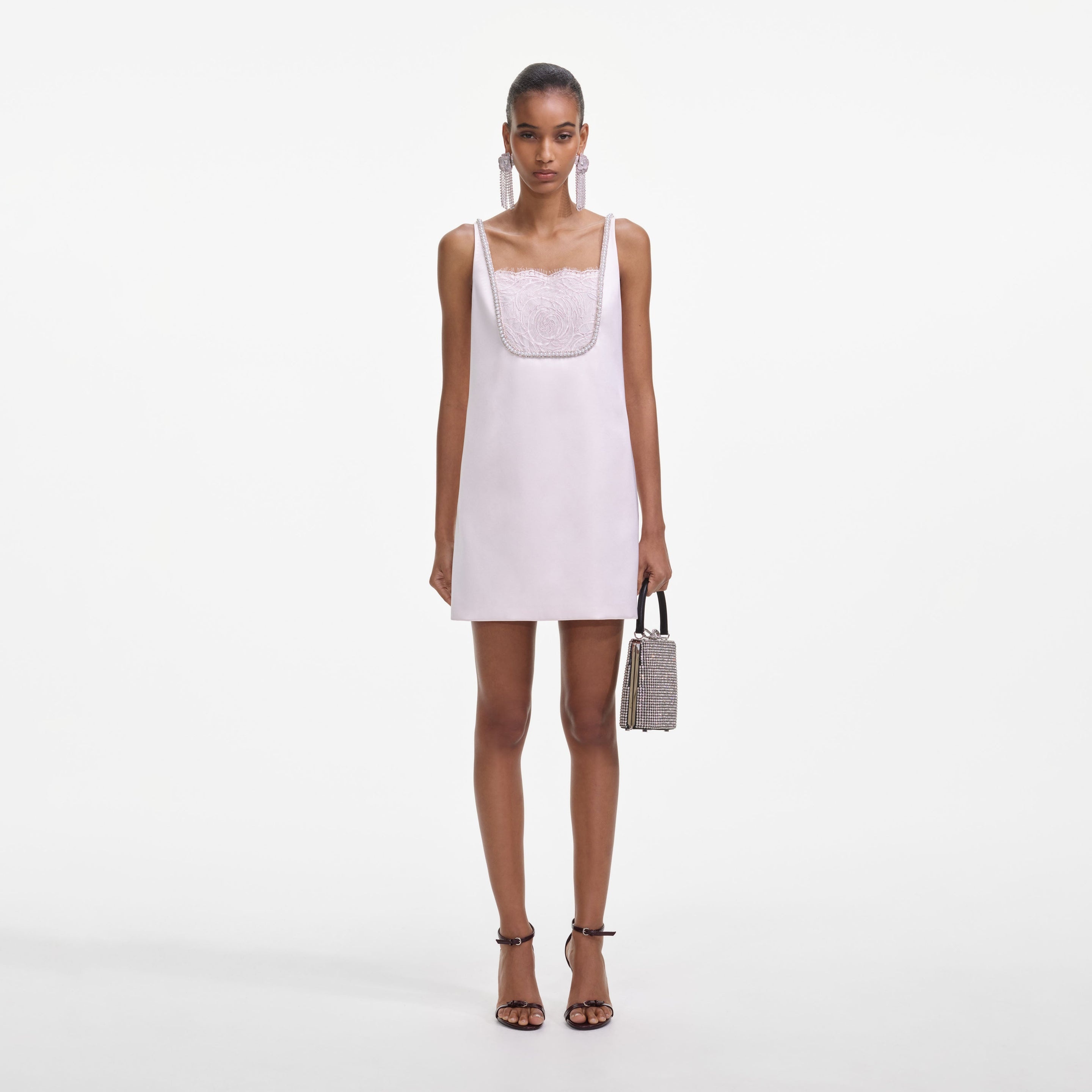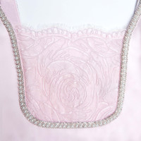 Details & Fit A retro Mod silhouette meets playful baby pink in this satin mini. Diamante trims and lace details add touches of brilliance – show off its leg-lengthening hem with a pair of sky-high platforms. - Fitted style, take one size up if between sizes - This style has minimal stretch - Zip closure at back - Lace bib detailing - Pearl trims - Model is 5ft10/178cm and wears a size UK 6 COMPOSITION 100% Polyester