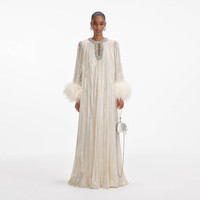 Details & Fit Going all out, this dress' metallic finish, embellished neckline and feathered cuffs guarantee an unforgettable entrance. Add our statement earrings and a glittering bag for extra style points. - True to size - Relaxed fit - Zip closure at back - Keyhole cut-out at front - Fully lined - Model is 5ft10/178cm and wears a size UK 6 COMPOSITION Main Fabric: 68% Silk Trim: 100% Birds Feathers Lining: 100% Polyester 32% Metallised Fibre (Ostrich Feathers + Turkey Feathers)
