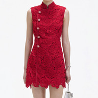 Details & Fit Luxe and lucky in red flower lace, this mini dress has a chic mandarin collar, diamanté buttons and a leg-lengthening hem — perfect for new year fêtes and other festive gatherings. COMPOSITION Main Fabric: 100% Polyester Lining: 100% Polyester