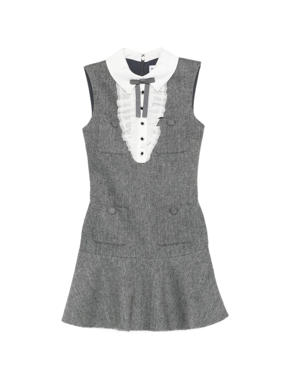 ruffled collared mini dress Highlights - Grey - Ruffled trim - Collar - Button embellishment - A-line skirt - Sleeveless Imported Composition Outer: Wool 62%, Polyester 38% Lining: Polyester 100% Washing instructions Dry Clean Only