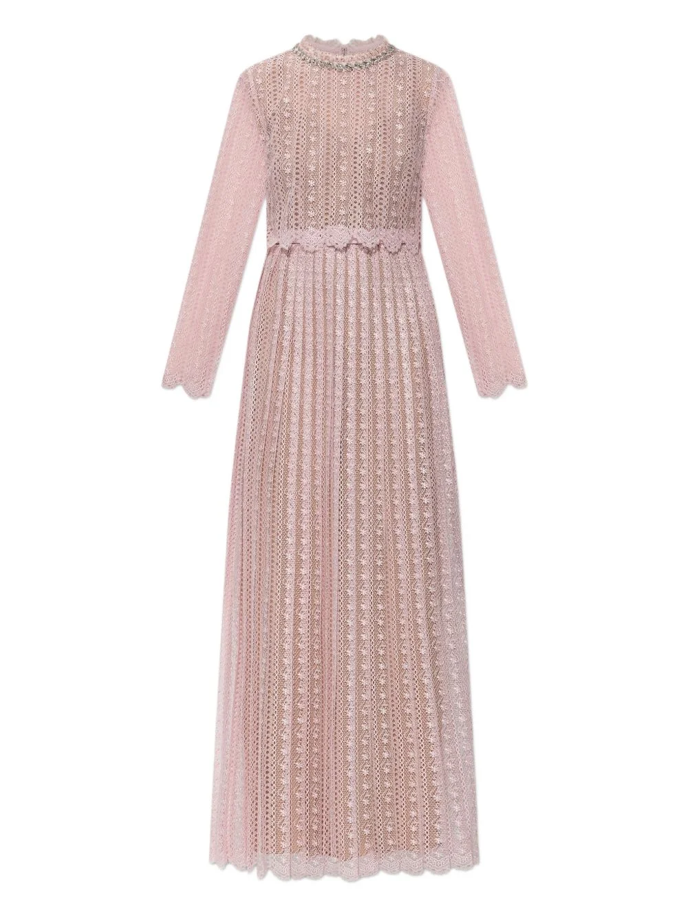 open-work long-sleeve dress Highlights - Pink - Pleated skirt - Scalloped trim - Long sleeves - Beaded detail Imported Composition Polyester 100% Washing instructions Read Manufacturer Guidelines