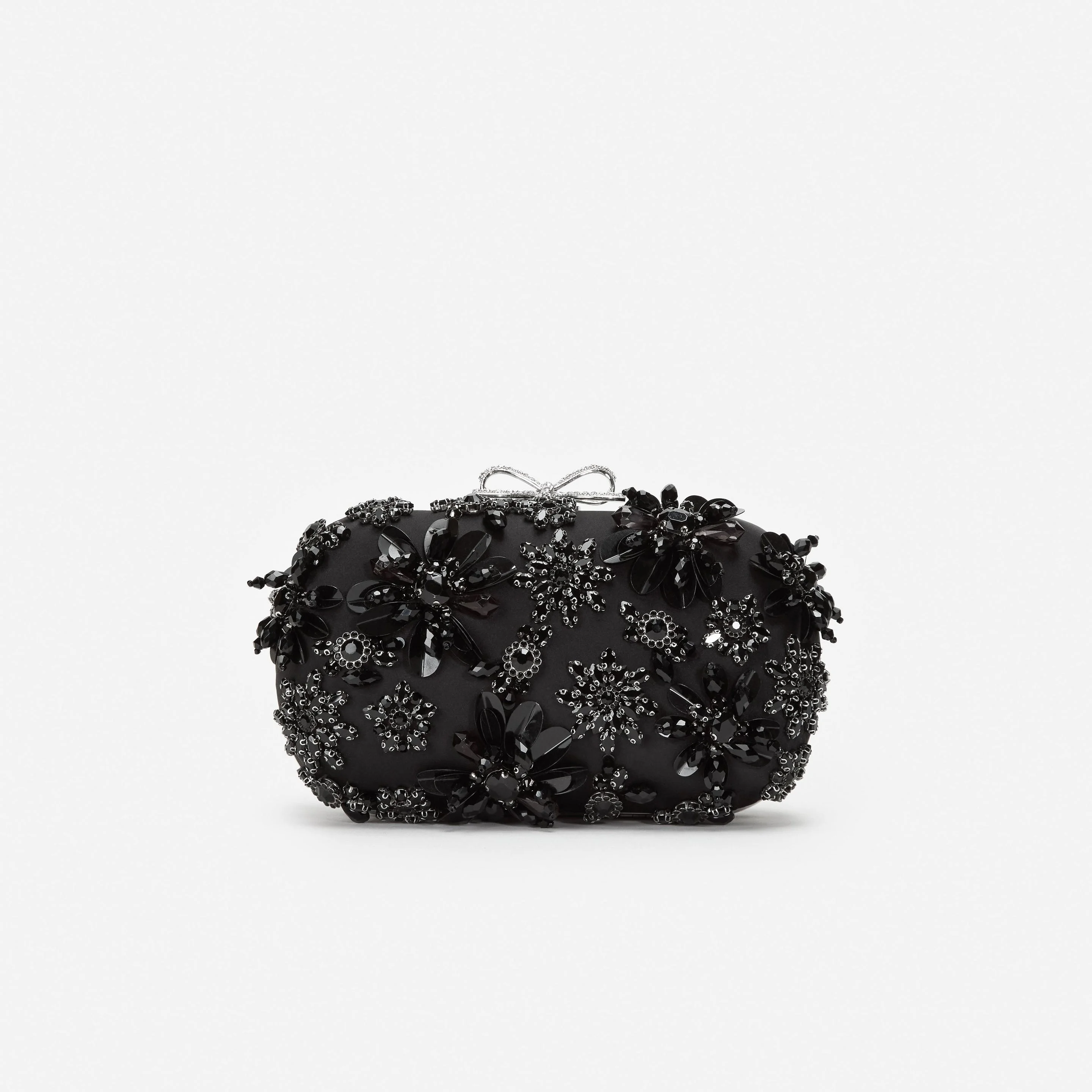 Details & Fit Signal dark romance with this black floral beaded satin clutch, which boasts sparkling crystal embroidery topped with our signature bow. Pair with our statement earrings for a final flourish. Composition Outer: 97% Polyester 3% Elastane Lining: 97% Polyester 3% Elastane