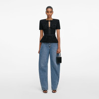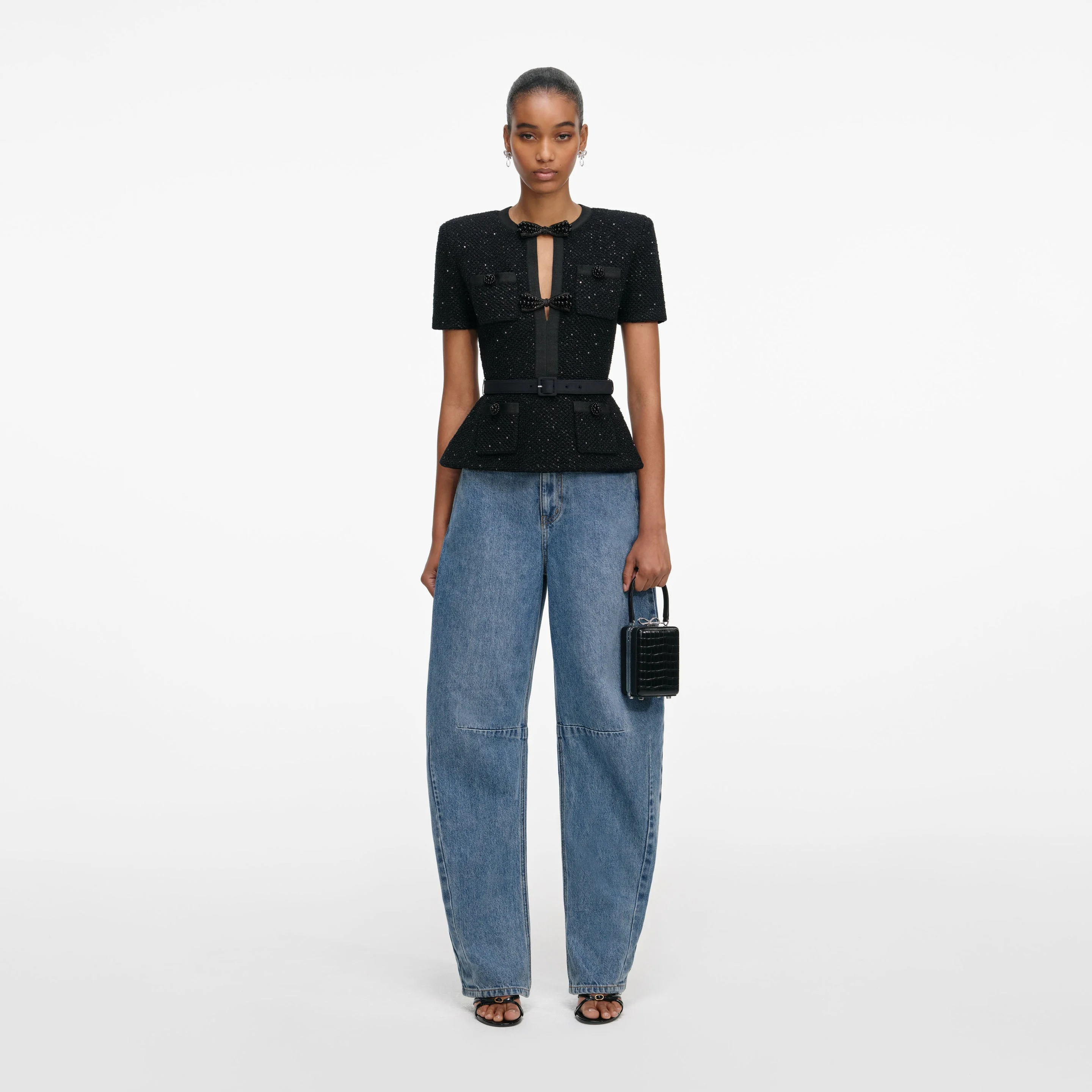 Details & Fit An effortless addition to every look, this black sequin knit top is framed by shoulder pads and bow-topped cut-outs at the front. Style with denim for dinner or add a slinky maxi for a night out. - True to size - Fabric has stretch - Snap popper closure down front - Embellished bow motifs - Removable shoulder pads - Model is 5ft10/178cm and wears a size S Composition Main: 45% Cotton 43% Polyester 12% Wool Trim: 100% Polyester Belt: 100% Polyester (Exclusive Of Trimmings)